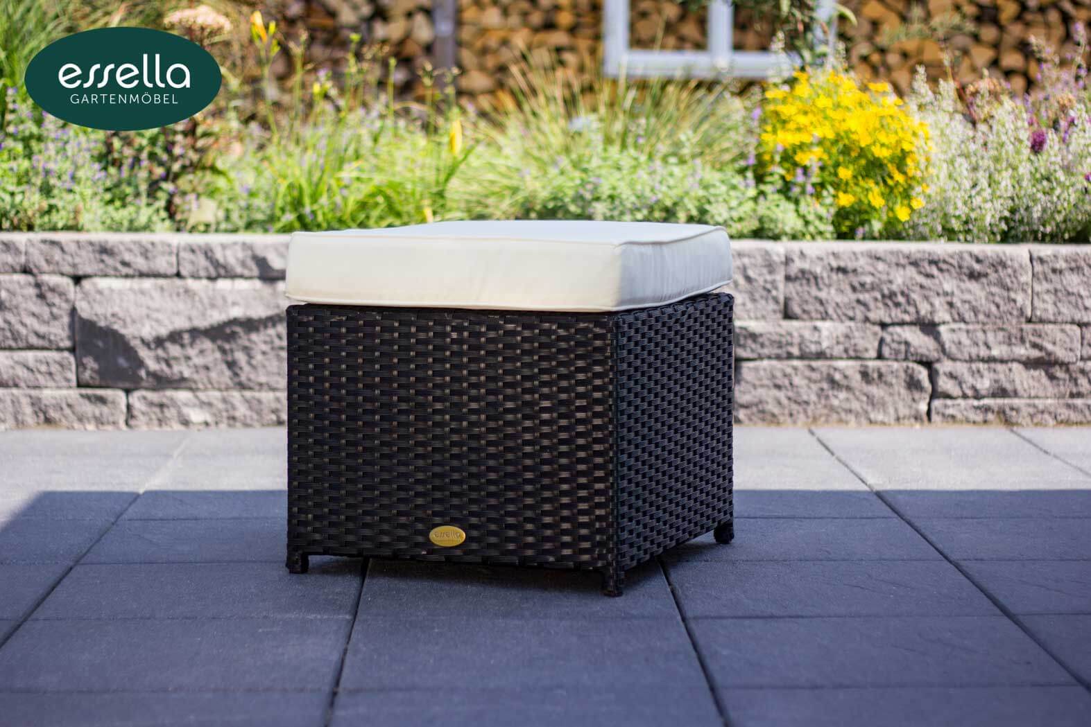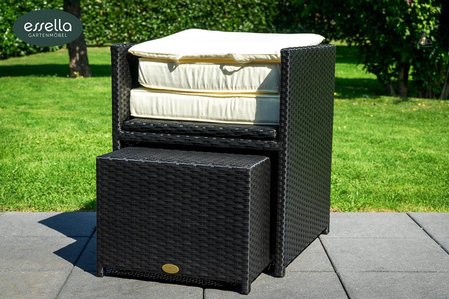 Delivery includes the comfortable cushions, the high-quality garden table and the practical footstools. The high-quality covers are water-repellent, robust and underline the elegant design of the poly rattan garden seating.